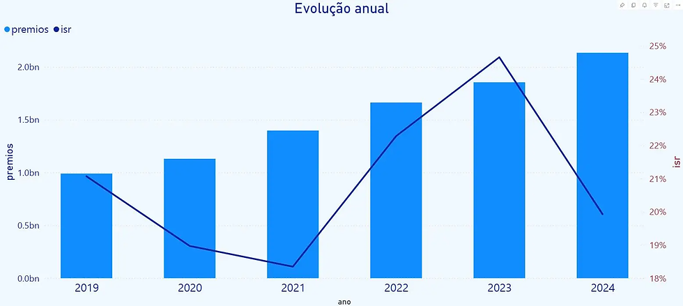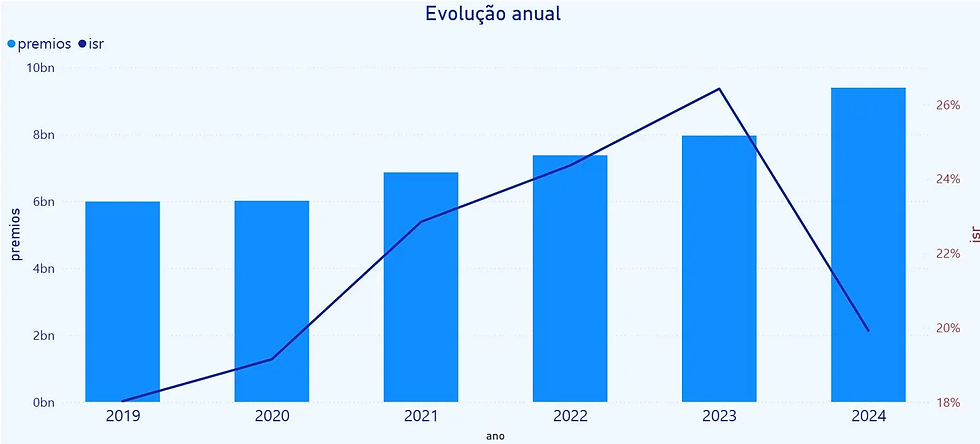 No gráfico a seguir, é possível ver esse movimento nos últimos cinco anos. Houve evolução dos valores de prêmios diretos, ou seja, os valores pagos pelos clientes às seguradoras ao contratarem o seguro (barras azuis) e dos sinistros, que são os acionamentos dos seguros (linha azul escura), contabilizados nos ramos de seguros para doenças graves ou doença terminal. No período de 2019 a 2024, a arrecadação das seguradoras com os prêmios mais do que dobrou, passando de R$ 1 bilhão em 2019 para mais de R$ 2 bilhões em 2024.
